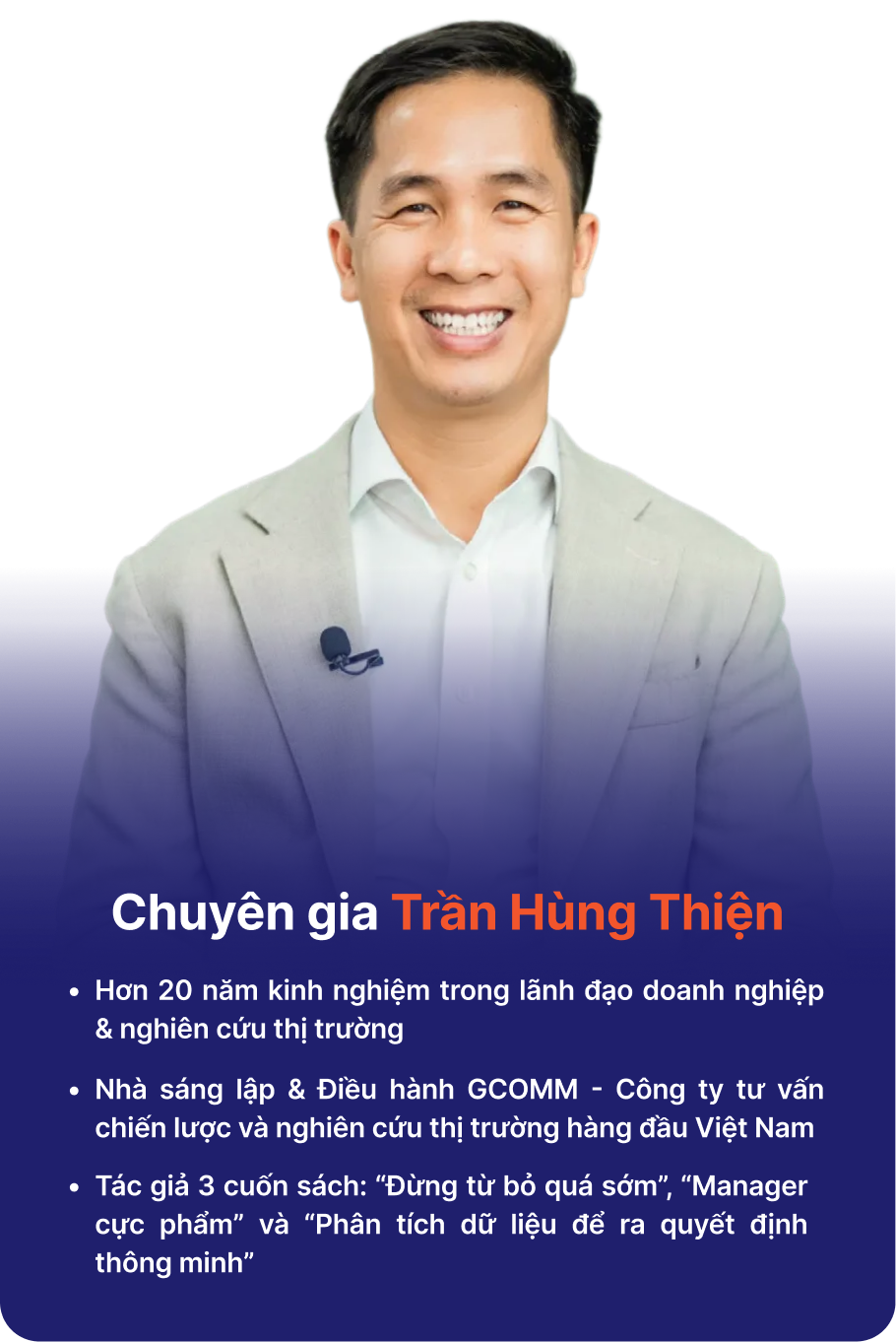 Private Masterclass cùng anh Trần Hùng Thiện với hơn 20+ năm kinh nghiệm lãnh đạo doanh nghiệp & nghiên cứu thị trường tại tập đoàn hàng đầu tại Việt Nam và quốc tế, sẽ giúp bạn hiểu sâu về cách sử dụng "mỏ vàng" dữ liệu nhân sự trong quản trị & lãnh đạo.